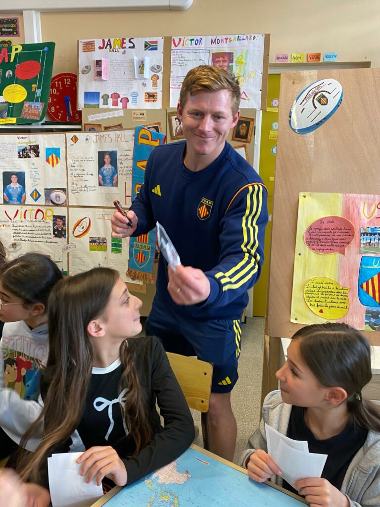 Dans la continuité de ce travail, le jeudi 19 février, toutes les classes participantes ont reçu la visite d’un joueur professionnel de l’USAP. Au total, 44 joueurs ont été mobilisés pour rencontrer les élèves. Ces temps d’échanges ont permis d’aborder le quotidien d’un sportif de haut niveau, la préparation, les valeurs du rugby et l’importance du collectif.